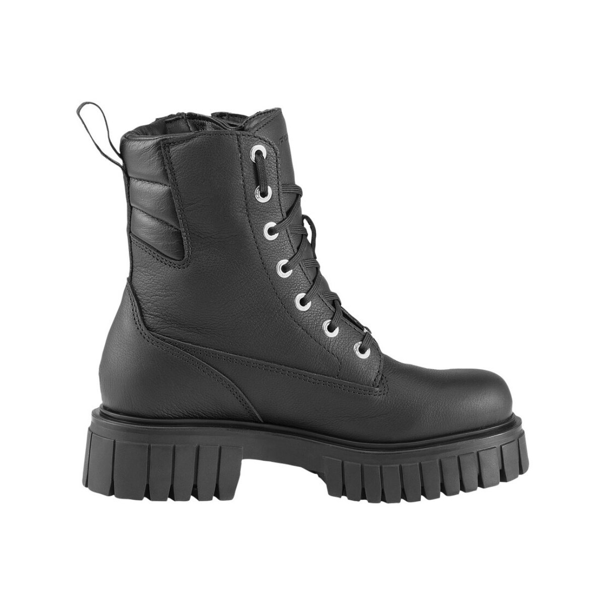 Stivale moto da donna. Tomaia in pelle pieno fiore. Suola fashion in gomma. Loop posteriore. Chiusura con zip e lacci con occhielli rinforzati. Membrana Drytex (resistente all’acqua e traspirante). Forma Lady Fit: specifica per il piede femminile. Protezione caviglia in TPU sagomate. Imbottiture con memoria. Soletta antibatterica sostituibile in materiale riciclato. CE EN13634:201